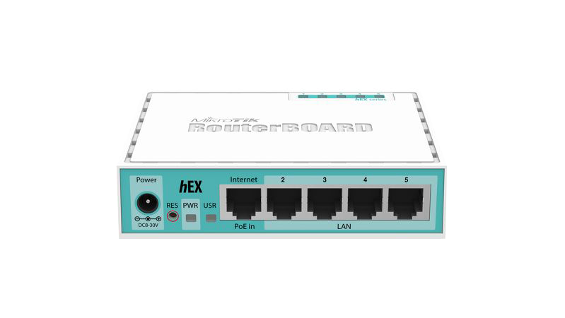 The hEX is a small five port Gigabit ethernet router in a nice plastic case for managing your wired SOHO network.