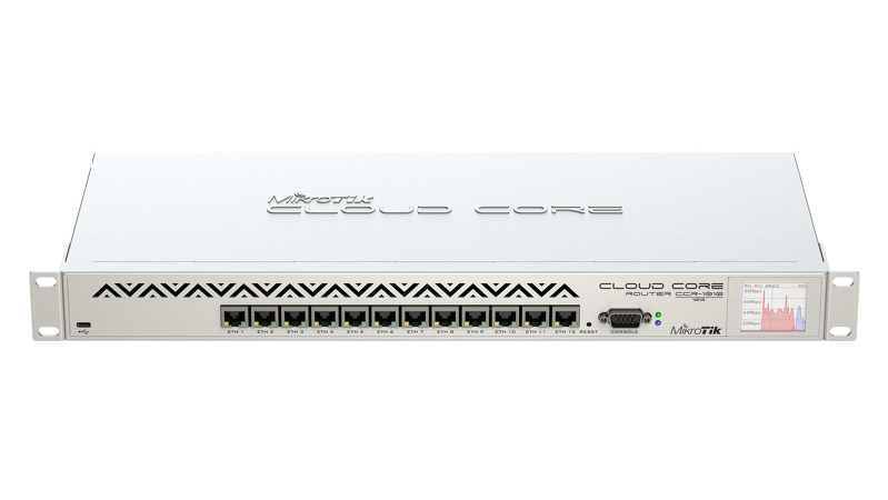 The device is available with a 1U rackmount case, has twelve Gigabit ethernet ports, a serial console cable and a USB port. The CCR1016-12G has two SODIMM slots, by default it is shipped with 2GB of RAM, but has no memory limit in RouterOS (will accept and utilize 16GB or more). It comes with power supply and 1U rackmount case.