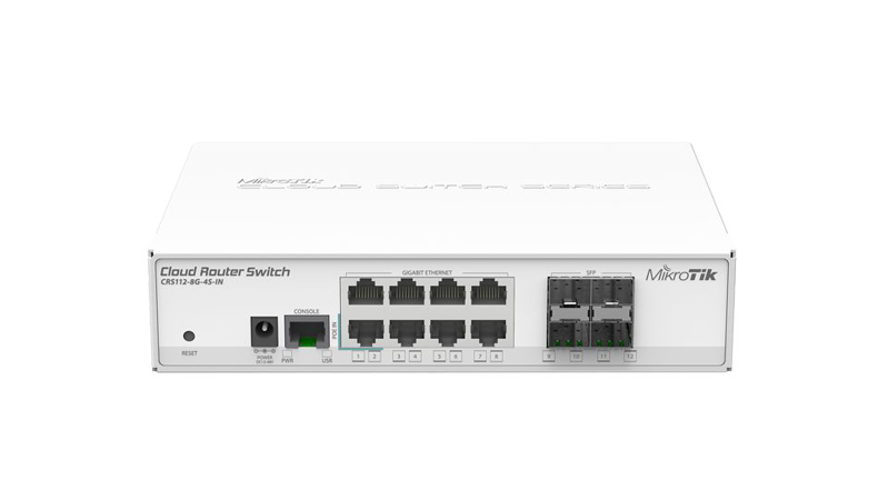 Cloud Router Switch 112-8G-4S-IN is a “small size low cost” member of our CRS series. It comes with eight Gigabit Ethernet ports and four SFP cages.