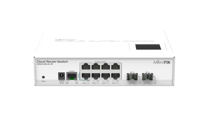 Cloud Router Switch 210-8G-2S+IN is new “small size low cost” member of our CRS series. It comes with eight Gigabit Ethernet ports and two SFP+ cages for 10G connectivity (first port supports 1.25G/10G modules, second port only 10G modules). Product supports 10-57V DC.